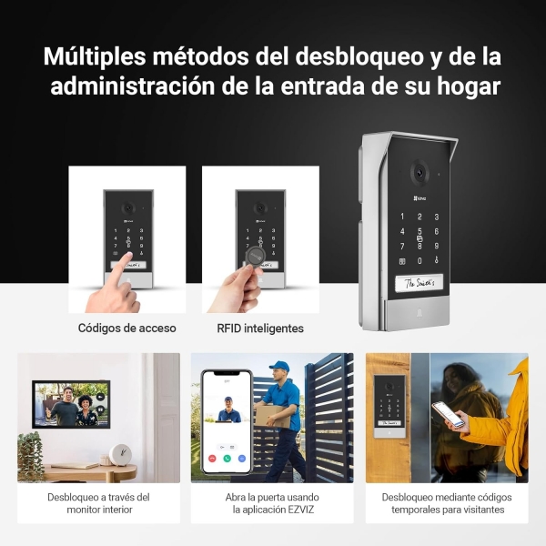 Dando un paso más allá con sus innovadores videoporteros, EZVIZ presenta ahora el EP7, una nueva innovación de la serie que viene con teclado integrado, batería extraíble, panel de carga solar compatible y estabilidad Wi-Fi mejorada. Eliminando por completo la necesidad de cableado entre el monitor interior y el portero exterior, este elegante kit fusiona a la perfección un montón de funciones inteligentes para mejorar la seguridad en el hogar, al tiempo que adapta una fácil instalación y suministro de energía para reducir al máximo las molestias - cambiando el juego de los videoporteros tradicionales. Preparado para el futuro y respetuoso con el medio ambiente, el EP7 eleva su puerta principal con una sofisticación sin esfuerzo.
